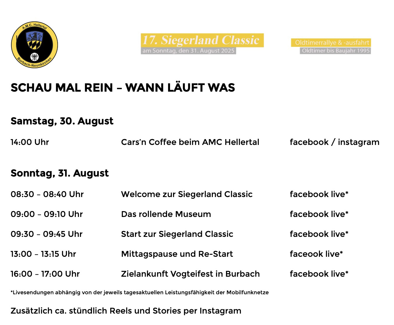 Die 17. Siegerland Classic des AMC Burbach seht ihr zu folgenden Zeiten live (abhängig von der jeweils tagesaktuellen Leistungsfähigkeit der Mobilfunknetze) via Social-Media TV auf der Facebook-Seite des AMC Burbach. Ferner gibt`s in etwa jede Stunde Reels und Storys auf unserer Instagram-Seite.